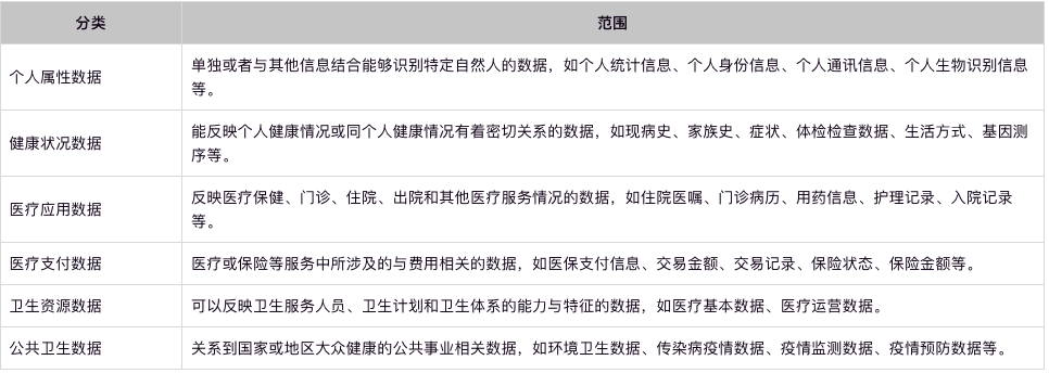 根据数据重要程度、⻛险级别以及对个⼈健康医疗数据主体可能造成的损害和影响的级别进⾏分级,可将健康医疗数据划分为以下5级: