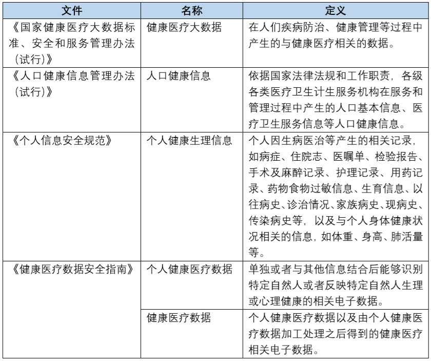 《指南》将“个人健康医疗数据”定义为“单独或者与其他信息结合后能够识别特定自然人或者反映特定自然人生理或心理健康的相关电子数据”。 并且在附录A给出一共11个举例。其中包括:向个人给予医疗服务过程中采集的有关个人的既往病史、社会史、家族史等病历记载,可穿戴设备采集的与个人健康相关的数据,关于个人的支付或医保数据等。在《指南》出台以前,关于健康医疗类数据的定义散见于各文件中,下表总结了相关定义: