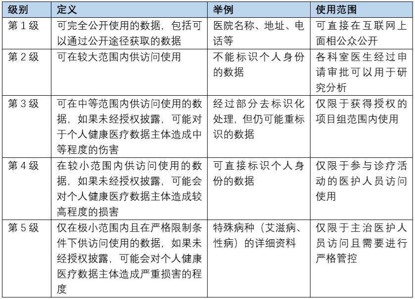 同时,《指南》还与现有的数据分级要求相呼应,根据数据的重要程度、风险级别以及对数据主体可能造成的损害和影响的级别分为5个级别。相关级别的举例及使用范围总结如下: